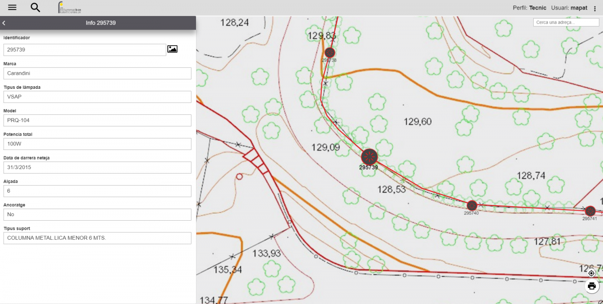 - Consultar el detall dels quadres de comandament i dels punts de llum: potència elèctrica, circuit al que pertany, suports, si disposa o no d’ancoratge, i tot tipus d’informació útil per als operaris desplaçats a camp.